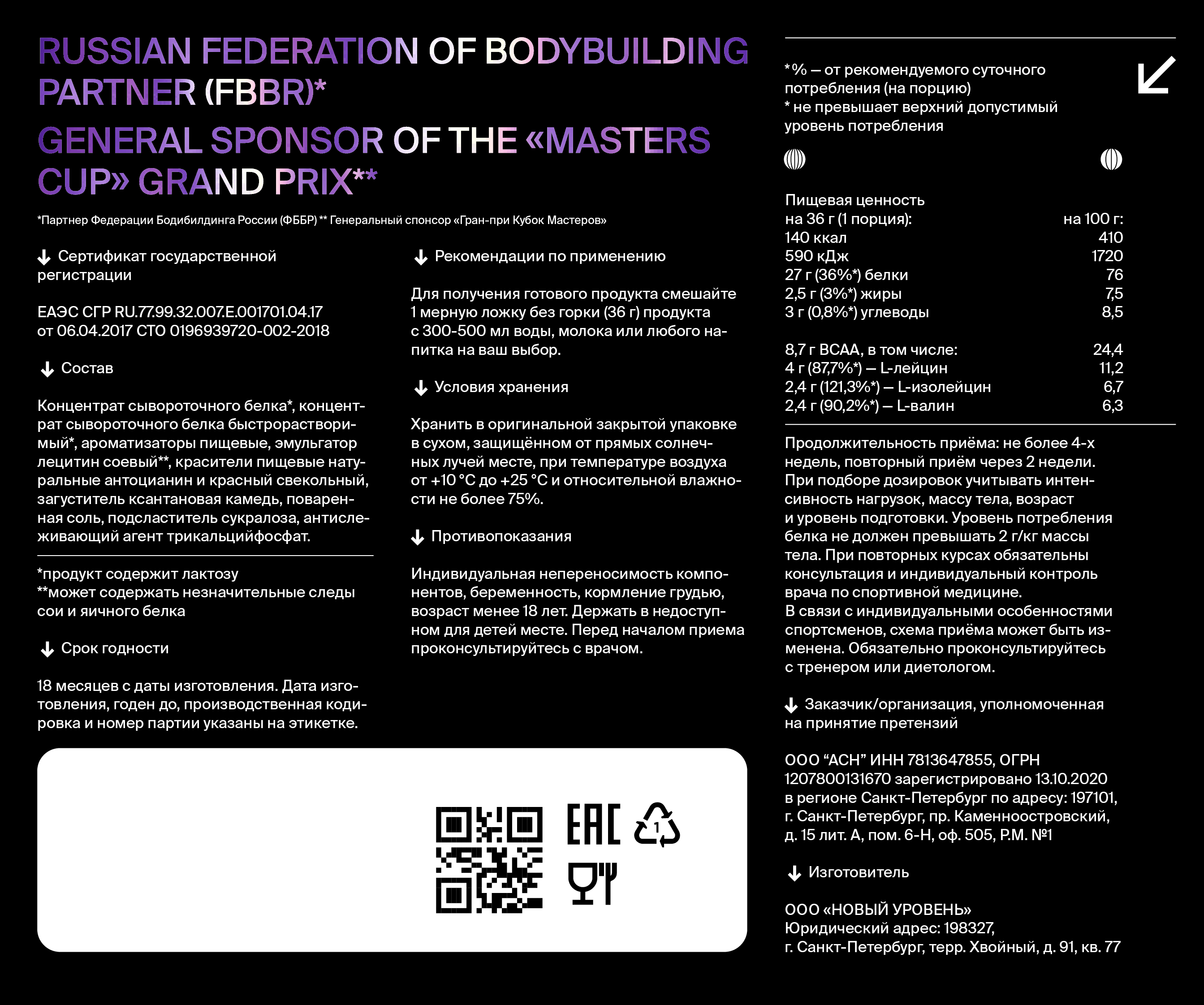 Энергетическая ценность 140 ккал Белки 27 г Жиры 2,5 г Углеводы 3 г ВСАА 8,7 г, в том числе: L-лейцин 4 г (87,7%*) L-изолейцин 2,4 г (121,3%*) L-валин 2,4 г (90,2%*)